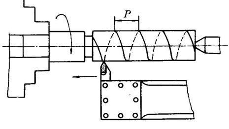 數(shù)控車(chē)床與普通車(chē)床車(chē)削螺紋的原理一樣:工件旋轉(zhuǎn),車(chē)刀沿工件軸線方向作等速移動(dòng),并保持工件轉(zhuǎn)一周,刀具移動(dòng)一個(gè)導(dǎo)程的距離,如圖